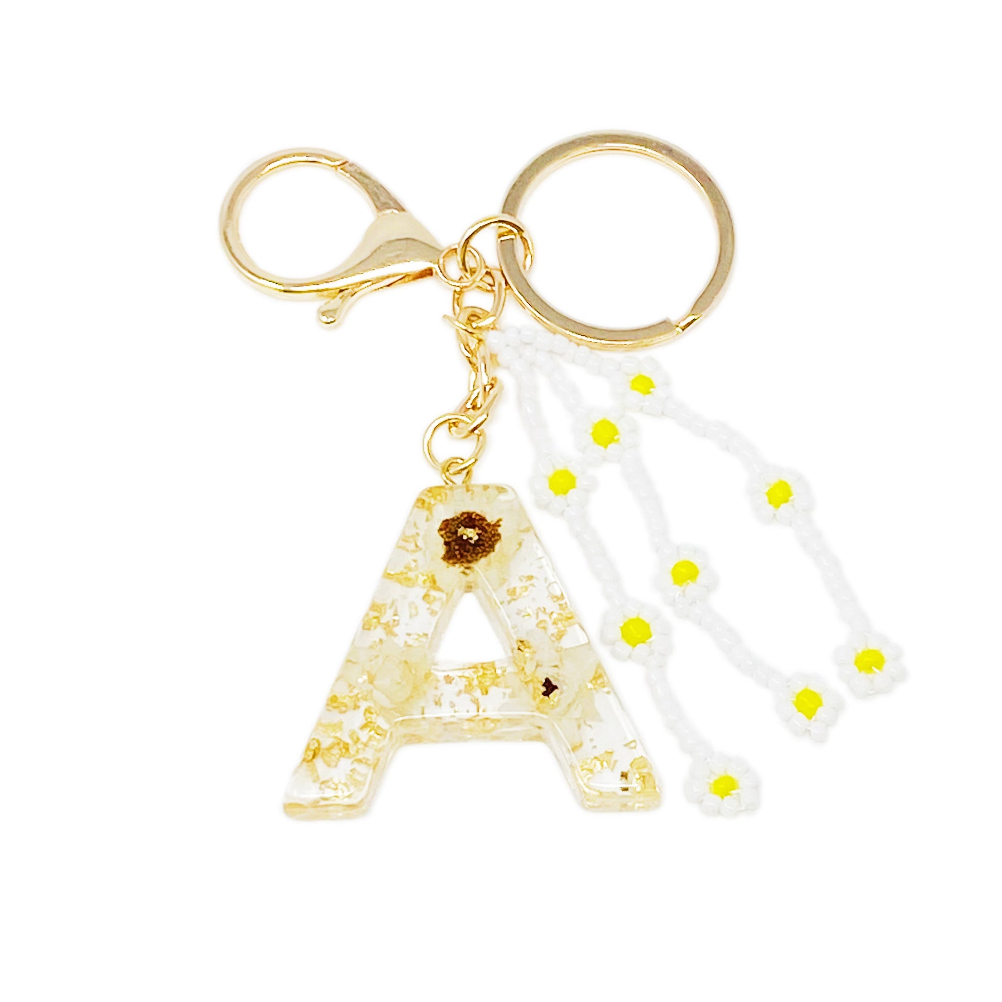 Such an adorable acrylic block initial key chain with real daisy flowers inside. Trendy daisy beaded strings adds more precious touch to this key chain.