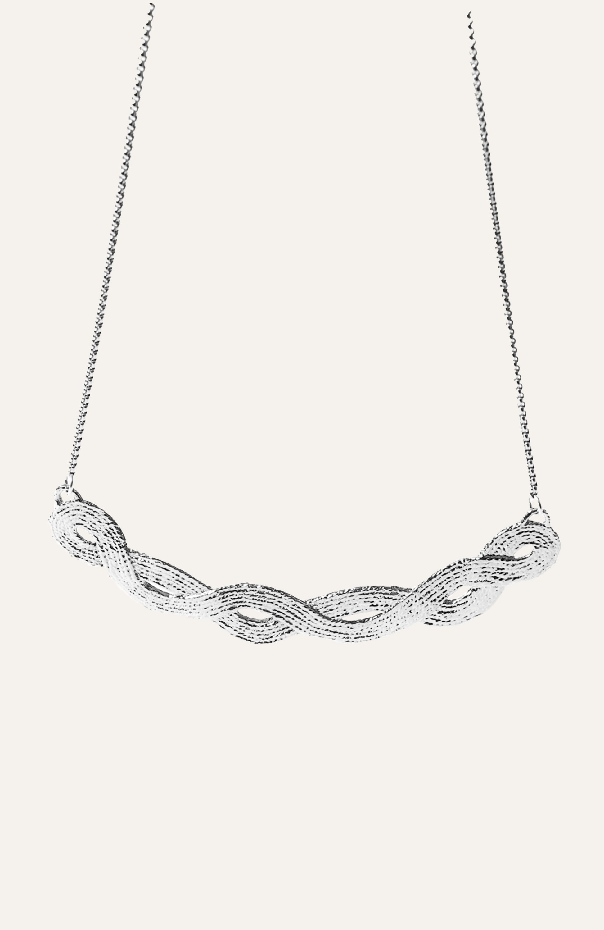 The Braid Pendant is a sculptural ode to movement, with its undulating, threadlike texture catching light from every angle. Designed to sit close as a choker, this reflective pendant measures 5 x 1 inches and suspends from a delicate 13.5-inch box chain, available in gold fill or sterling silver. Choose from 14k gold-plated, nickel-free reclaimed brass or solid 925 sterling silver—each piece is made to order in NYC, crafted with intention and artistry.
