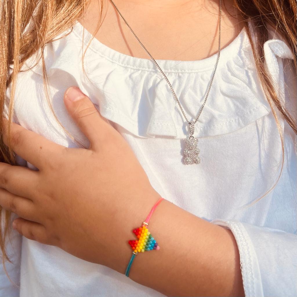 A rhinestone-studded teddy bear charm attached to a sterling silver necklace