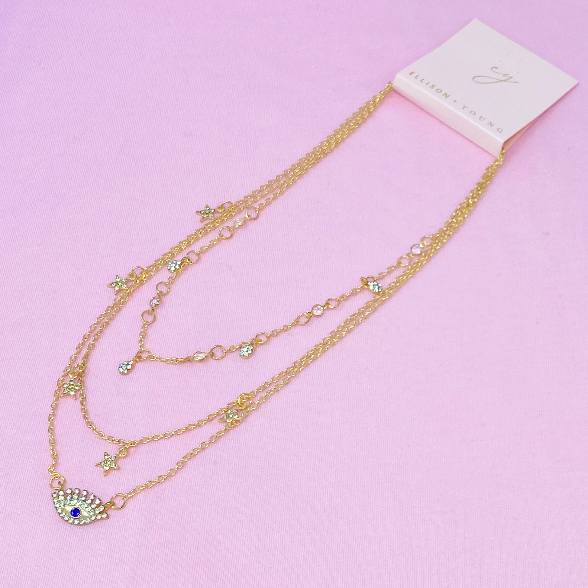 Triple layered necklace with trendy elements all around such as stars and an eye.