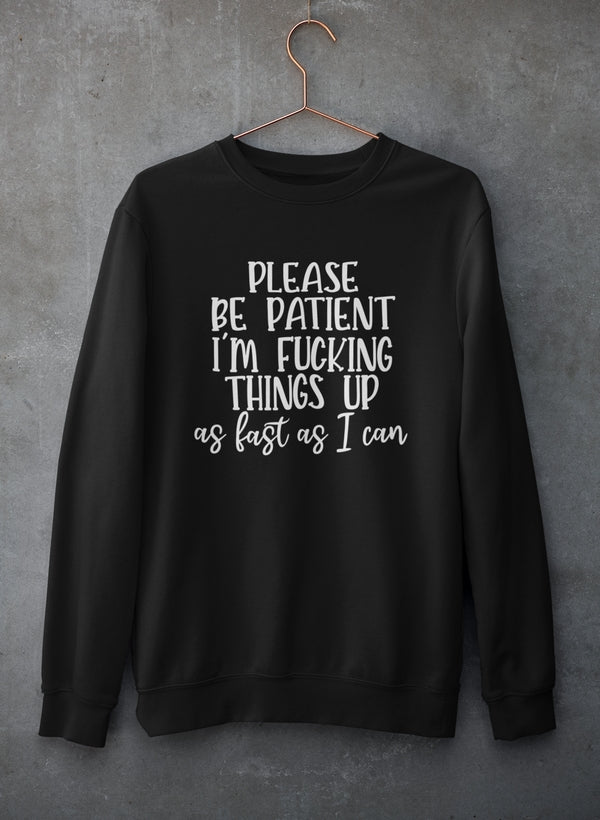 Please Be Patient Sweat Shirt Elevate your winter wardrobe with our stylish and cozy sweatshirts, designed to impress. Made in the USA using high-quality cotton fleece, these sweatshirts deliver unmatched comfort and warmth. The digitally printed designs add a touch of artistry to your everyday style, making a bold fashion statement. Moms will love the versatility and easy care, while women will adore the unique patterns that reflect their personality. From artistic designs to digitally printed masterpieces, our sweatshirt collection offers something for everyone. Discover the beauty of wearable art and embrace fashion that's both trendy and comfortable.