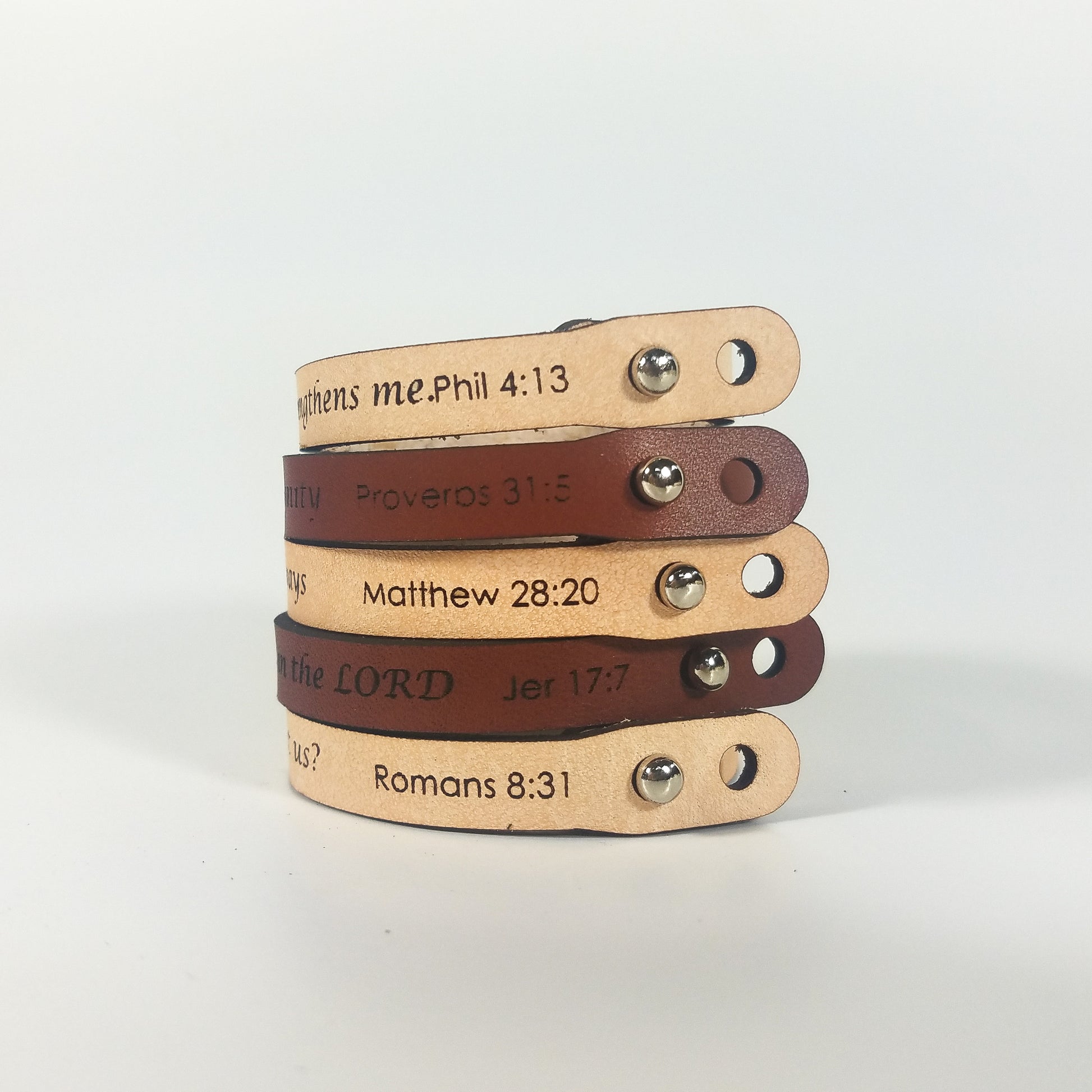 Our spiritual quote bracelets are laser etched on vege-tanned genuine leather. Bracelets include the chapter reference.