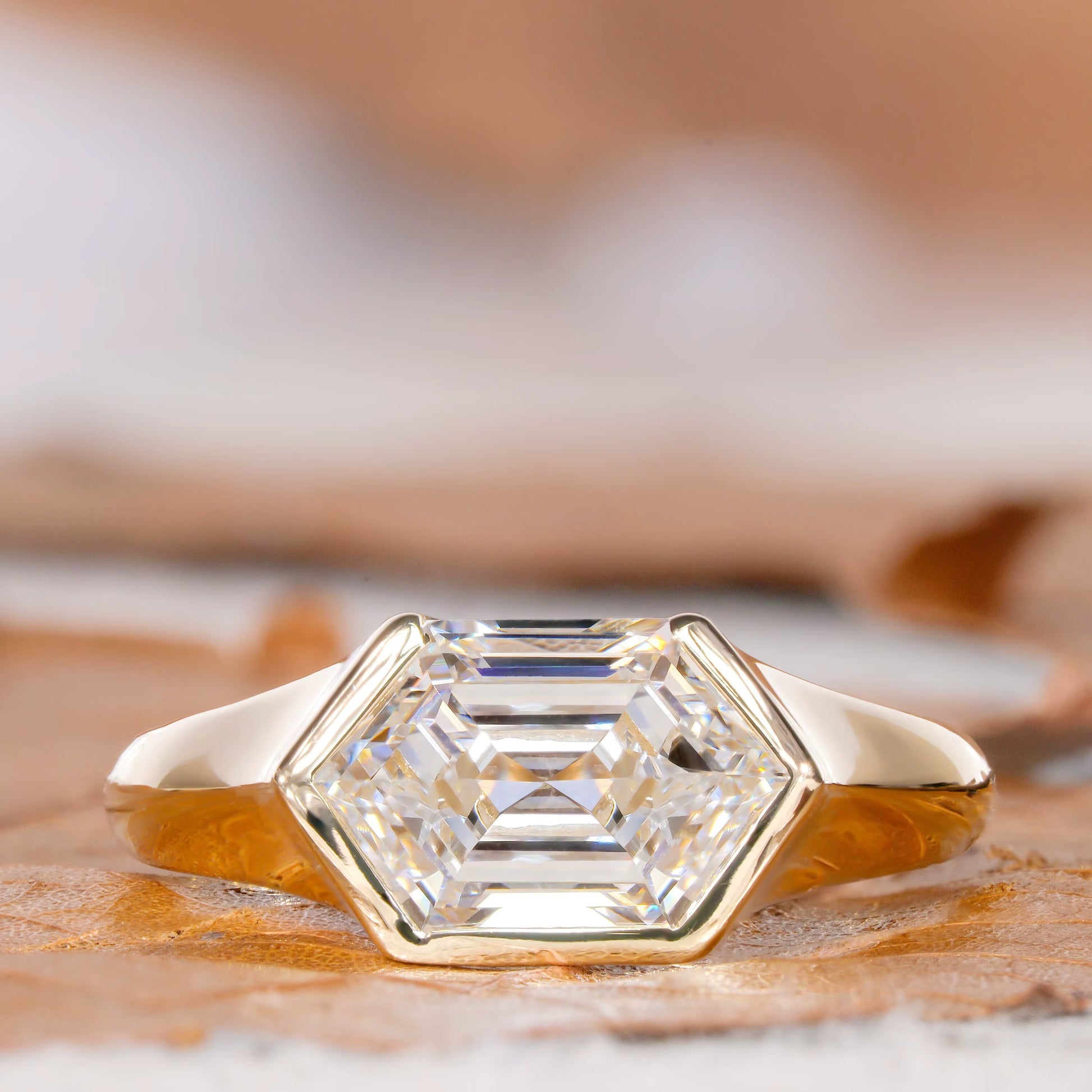 Tiana rings showcase a distinctive design inspired by vintage and Art Deco styles, offering both symmetrical, square-like and elongated rectangular shapes. Featuring hexagon-cut diamonds, these rings are prized for their exceptional brilliance and unique character. The hexagonal cut symbolizes balance and harmony, making Tiana an elegant and meaningful alternative to conventional ring designs.