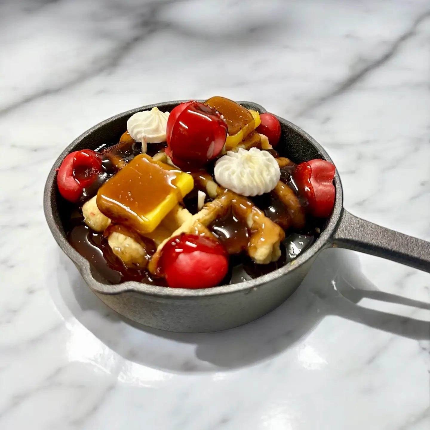 Experience the irresistible charm of a waffle breakfast with this expertly crafted candle. Designed to resemble a golden waffle drizzled with syrup and topped with fresh cherries, whipped cream, and a pat of butter, it delivers a delightful visual treat. Though it looks deliciously edible, this candle offers a warm, inviting ambiance to any space, making it a perfect addition for those who appreciate detailed and unique home decor.